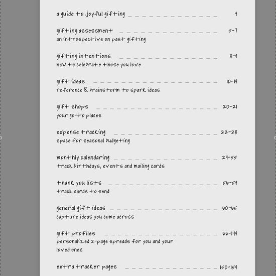 The Gift Journal was created for people who love celebrating others but want an organized way to remember ideas throughout the year. Inside, you’ll find ideas, prompts, trackers, and space to spark more meaningful giving moments.