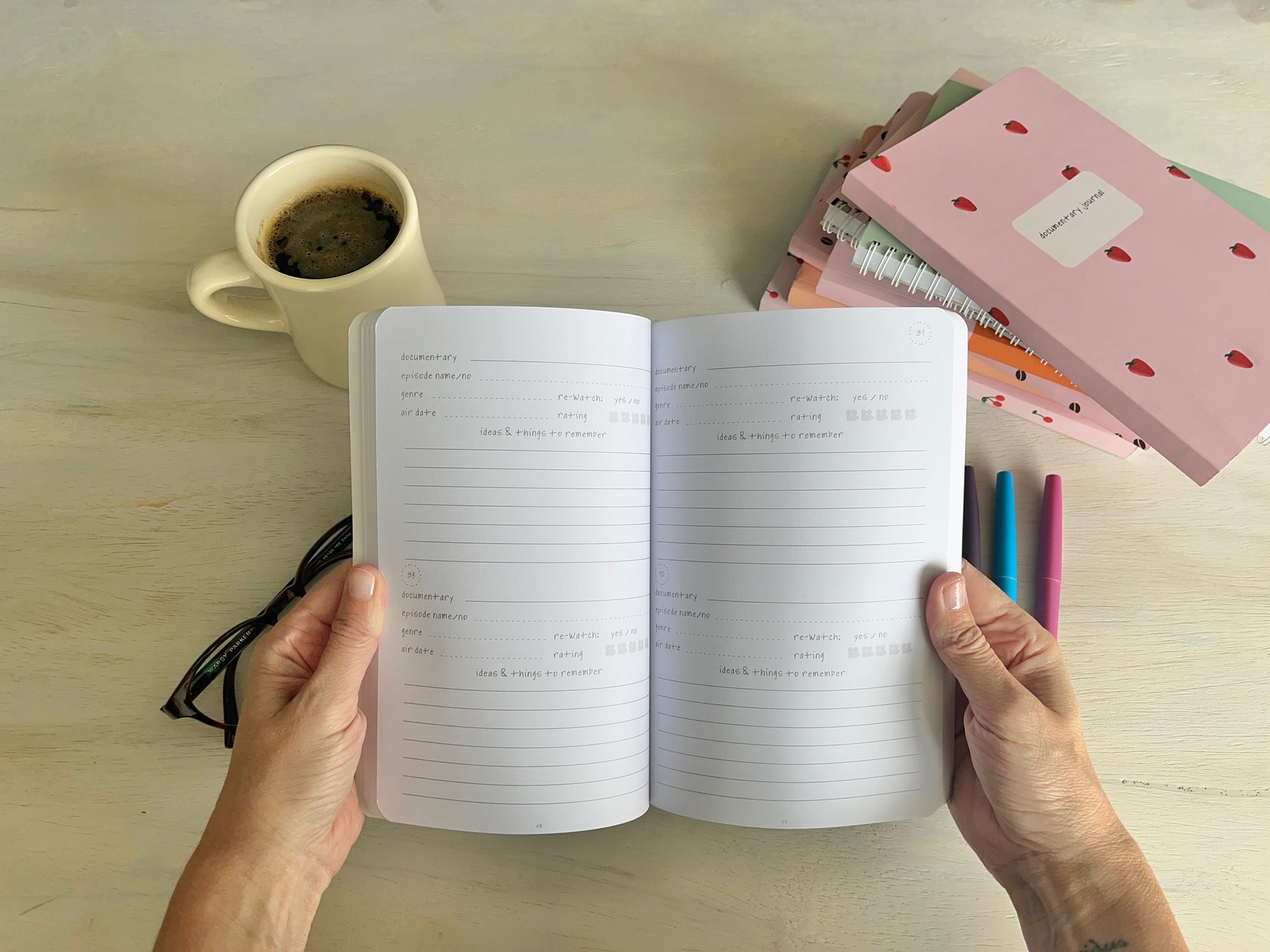 - 160 pages (80 sheets) includes 200 doc entries, watching habits and intentions, doc and episode lists, to-watch list, blank templates, extra entry pages.